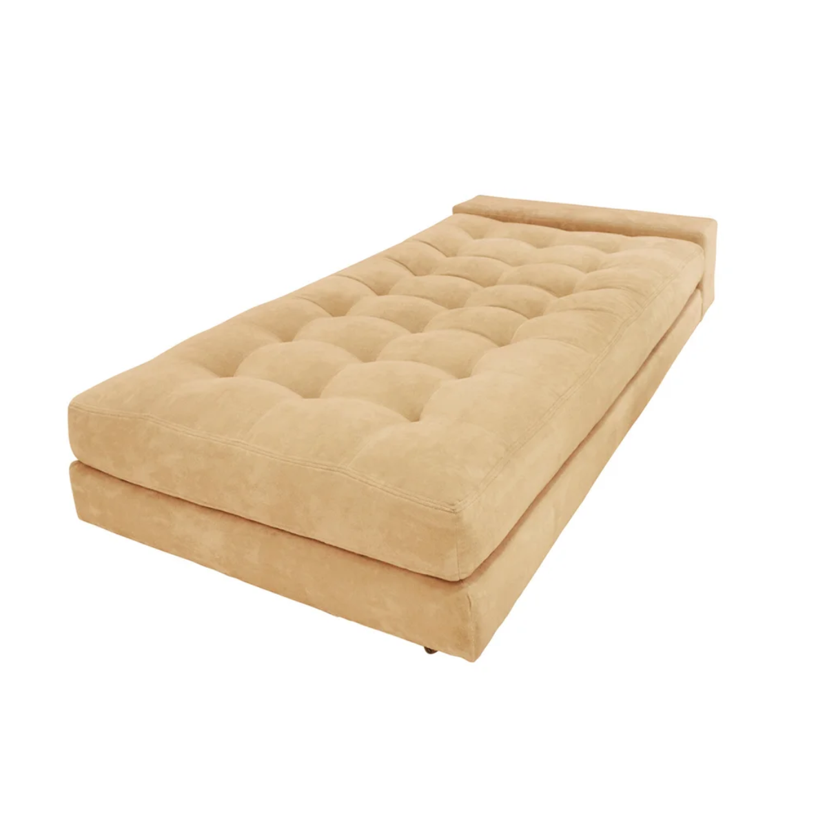 Upholstered "High Low" multilevel seating area (model 7070) on lucite legs with rolling “Lounge” bench on castors (model 7075) which slides underneath by Vladimir Kagan, Omnibus Collection, American 1977 (signed with original labels). This is a unique Kagan design.